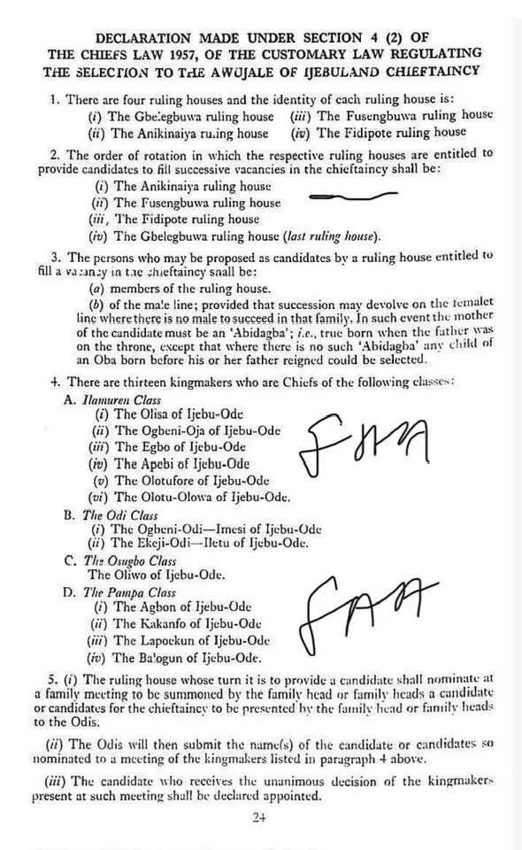 A document sighted by DAILY POST, tagged: “Declaration made under Section 4(2) of the Chiefs Law 1957 of the Customary Law Regulating the Selection to the Chieftaincy,” reads below: