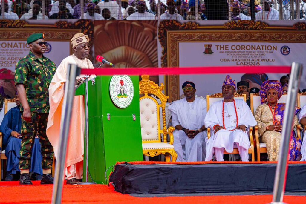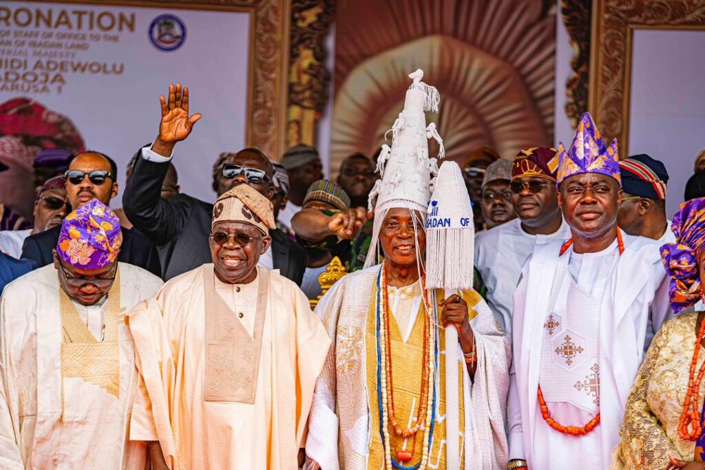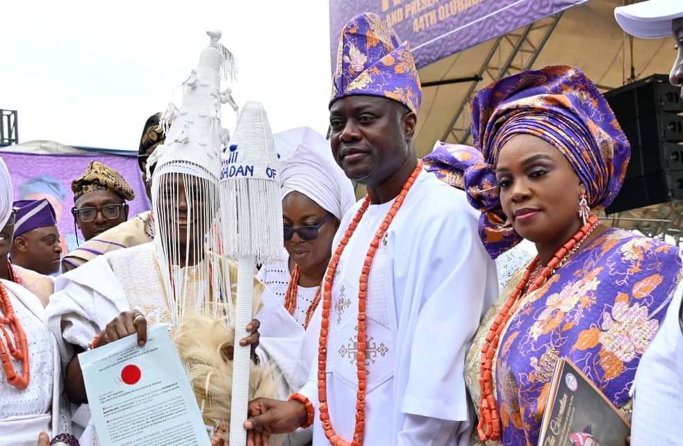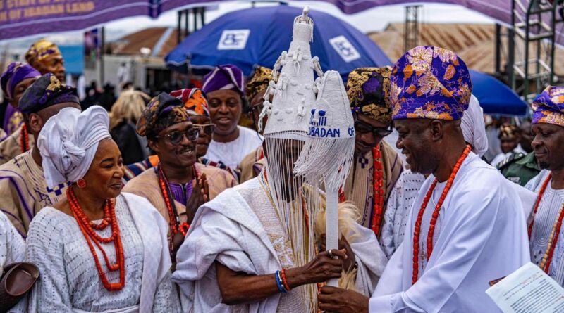 Traditional music, including Ebenezer Obey’s “Ibadan,” filled the air, celebrating unity and pride before Taye Currency entertained the gathering. The arrival of the president and Governor Makinde, who presented the staff of office, was met with cheers. Christian and Muslim clerics led prayers before cultural performers returned with praise, poetry and dance.